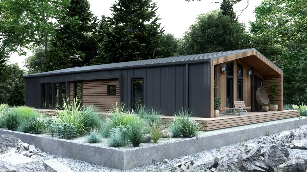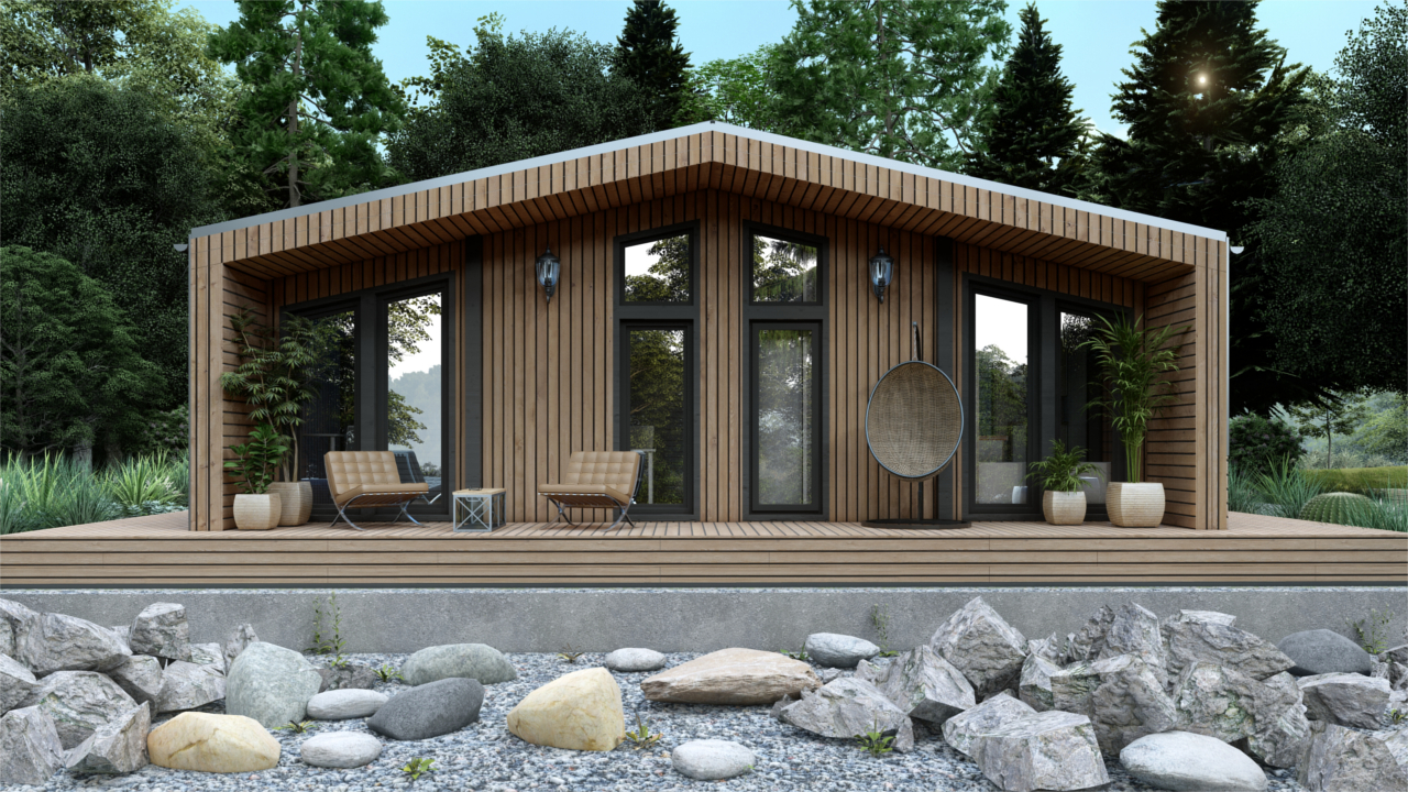 Барн-150 – модульный дом в стиле барнхаус, предназначенный для круглогодичного проживания, площадью 150 м², включает в себя 4 спальни, кухню-гостиную, тамбур и 2 санузла. Отличное решение постоянного проживания или загородного глэмпинг-отеля.(Размер дома по внешнему контуру)