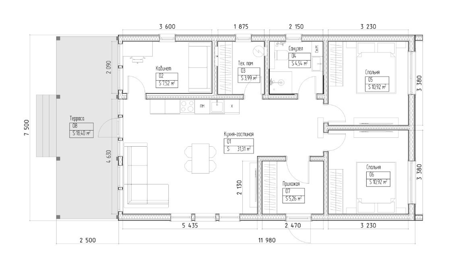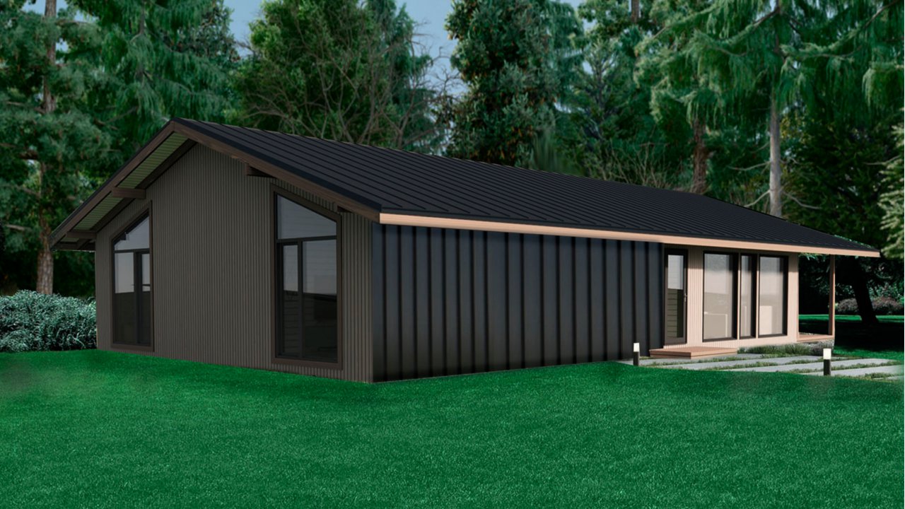Шале-110 – модульный дом в стиле Барн (Шале), предназначенный для круглогодичного проживания, площадью 110 м², включает в себя 4 спальни, кухню-гостиную и санузел.